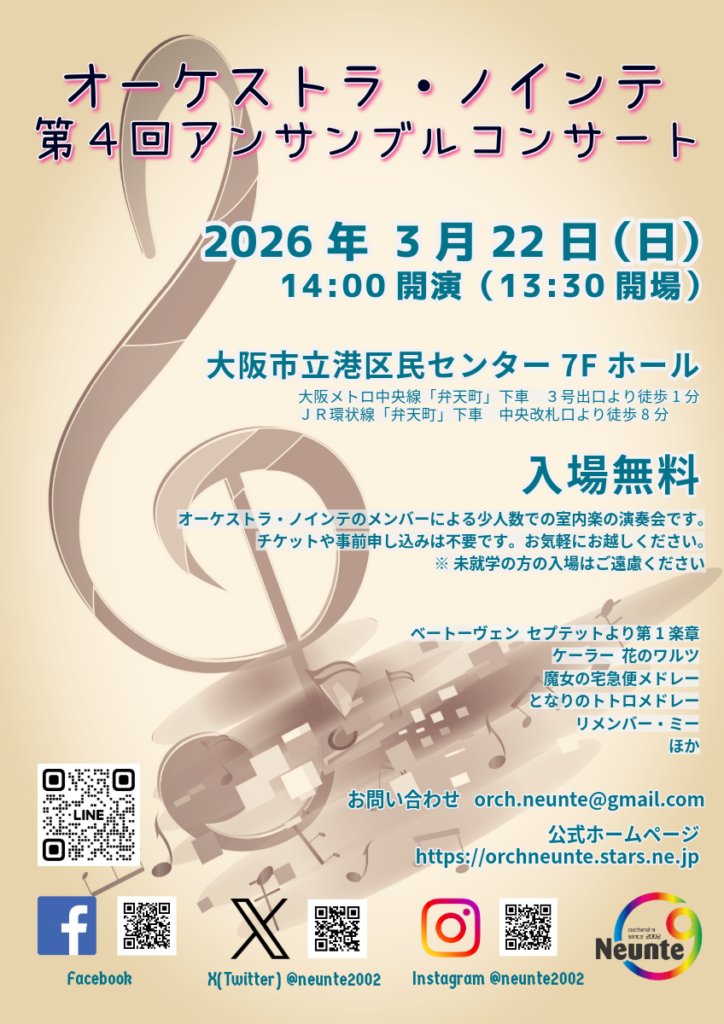 | 第4回 アンサンブル・コンサート | 2026年3月22日(日) | 港区民センター ホール | セプテットより第1楽章 (ベートーヴェン) / 花のワルツ (ケーラー) / 魔女の宅急便メドレー / となりのトトロメドレー / リメンバー・ミー ほか |